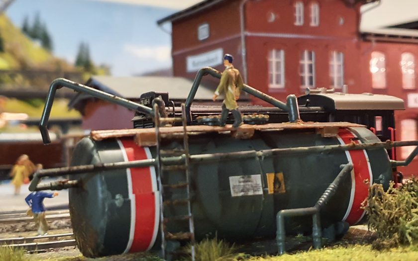 WeiterlesenDie V36 braucht Diesel. Entstanden ist der liegende Tank aus einem Faller 131268 „2 Lagertanks“. Beide Tanks einfach quer gelegt und mit etwas Bastelresten eine Laufplanke angeklebt. Dann das Ganze mit Rost von Noch etwas