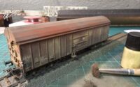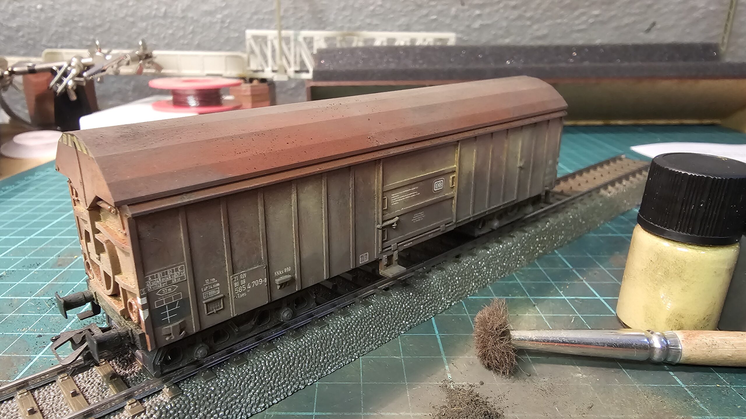 Frisch ans Werk habe ich die Noch Pulverfarben (61200) verwendet und dabei nicht bedacht, dass diese nicht wirklich haften würden ohne dass der Wagen mit Primer grundiert wurde. Das nebenstehende „trockene“ Ergebnis gefiel mir jedoch gut.