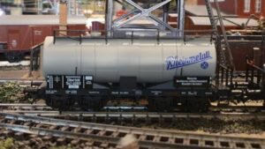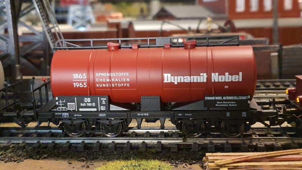 So schiebt die Märklin Köf 4816 zwei hochinteressante Kesselwagen der Marke BRAWA über das Abstellgleis. Zu sehen ist ein Kesselwagen der Rheinmetall eingestellt bei der DRG aus der Epoche 2 (Artikel 2057), so wie ein mindestens genauso „explosives“ Modell eines Kesselwagens von Dynamit Nobel (Artikel 47069) aus der Epoche 3. Die Wagen sind so hoch detailliert, dass ich mich einfach nicht davon trennen kann. BRAWA baut einfach Modelle, die so detailreich sind, dass sie sich von anderen Marken doch schon mit bloßem Auge unterscheiden.
