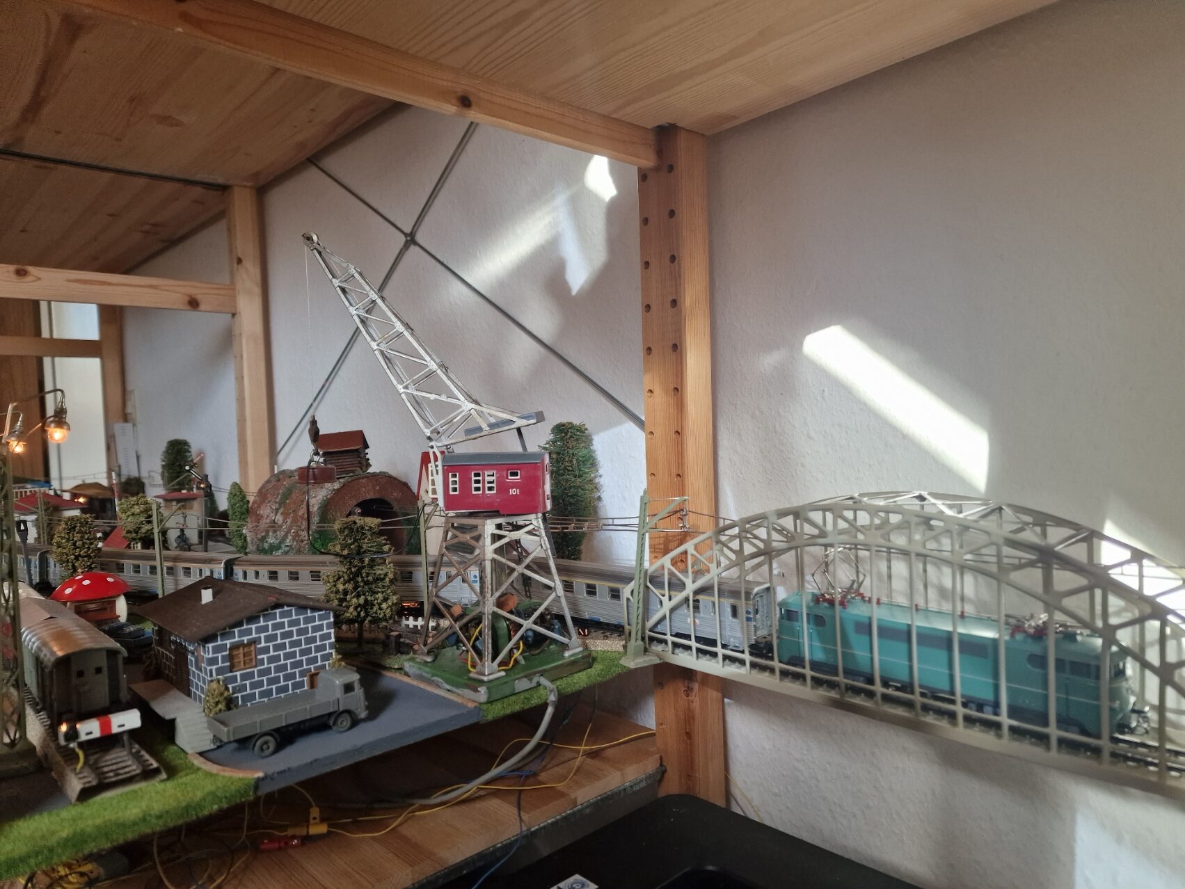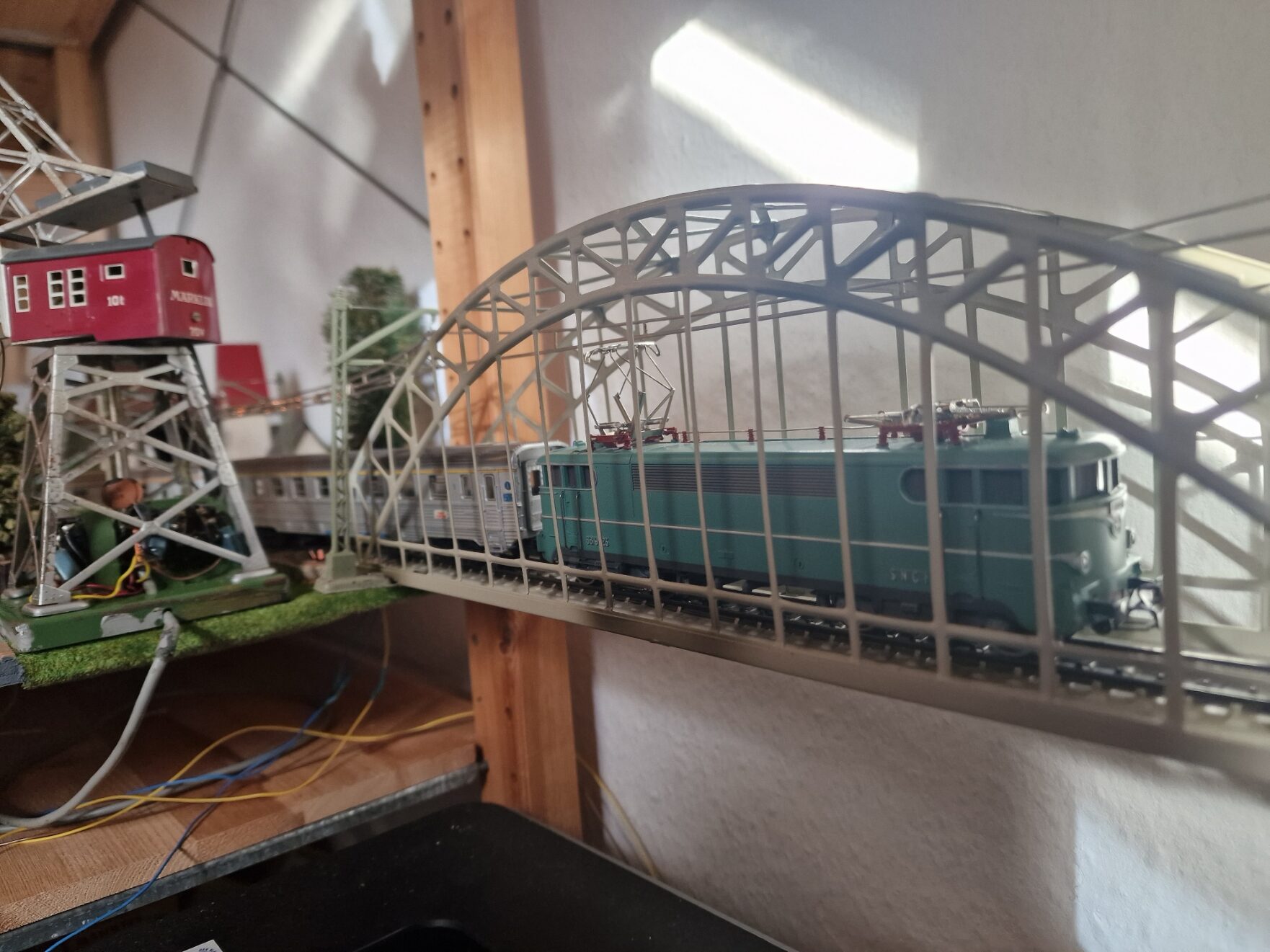 Auf den Fotos ist ein Zug aus 4 INOX Wagen 450 und der BB 9223 zu sehen, wie er die Bogenbrücke auf dem Vintage Layout überquert.