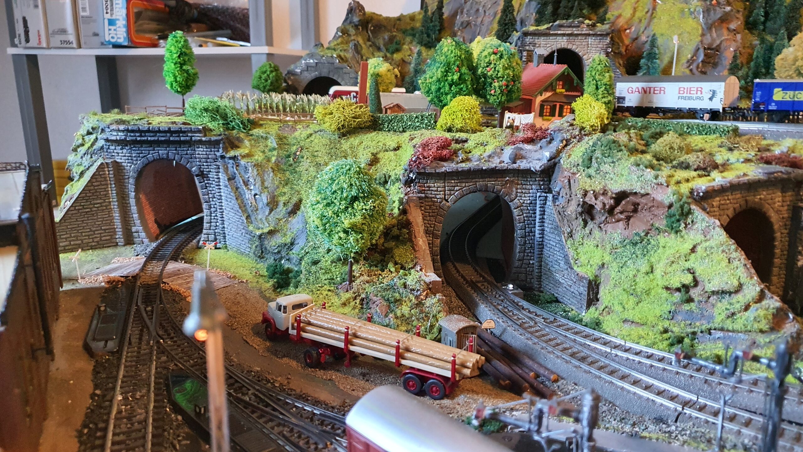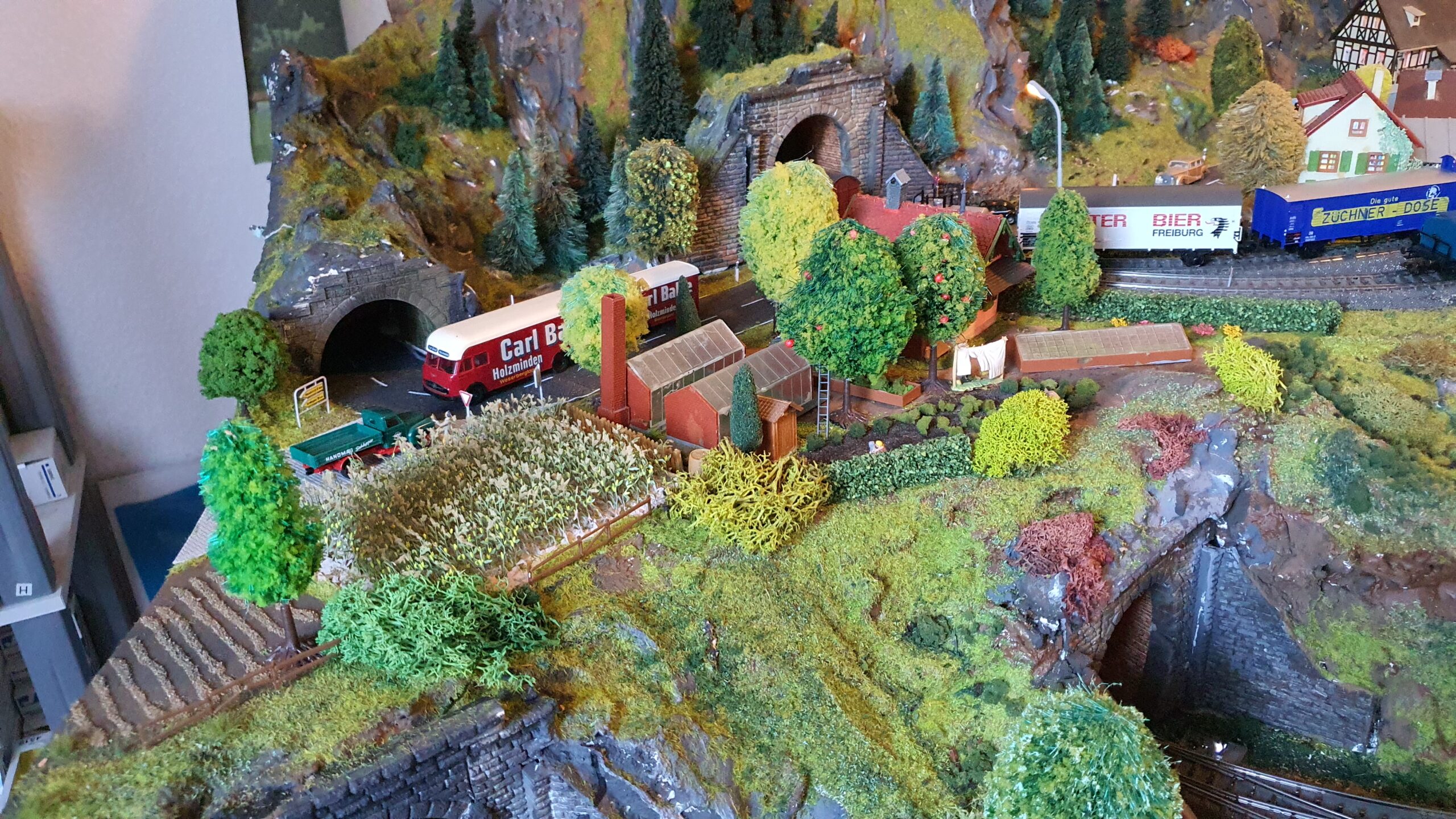 Hinter dem Anbauteil des Betriebswerks klaffte bisher immer ein Lücke. Züge haben den Teil hinter der Platte einfach umfahren. Nun ist das Oberdorf ein wenig gewachsen. Züge fahren durch das neue Tunnelportal. Die Hauptstraße wurde etwas verlängert und ein Straßentunnel, der eine Höhenbegrenzung hat zwingt LKW auf die längere Umfahrung des Berges.