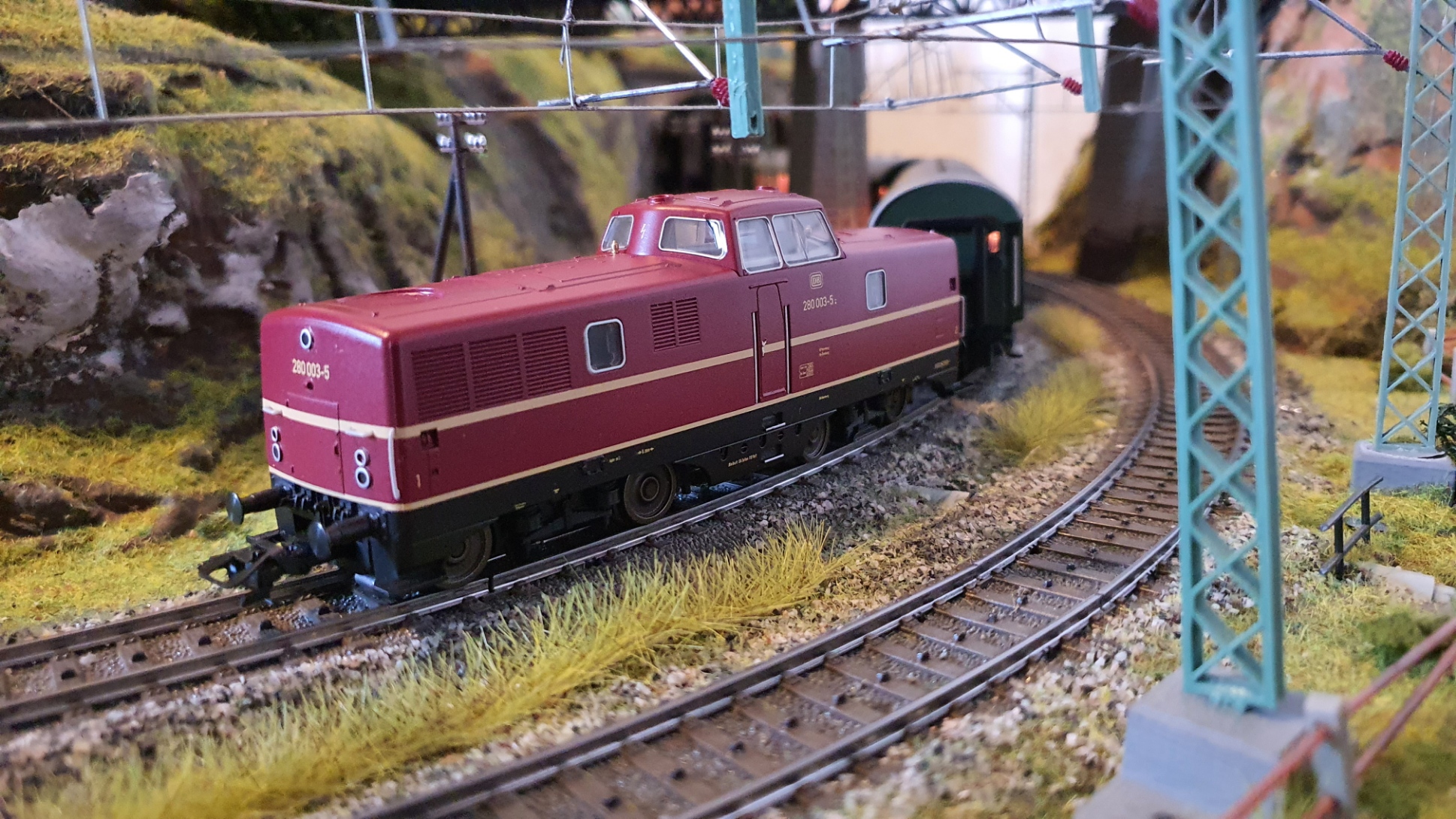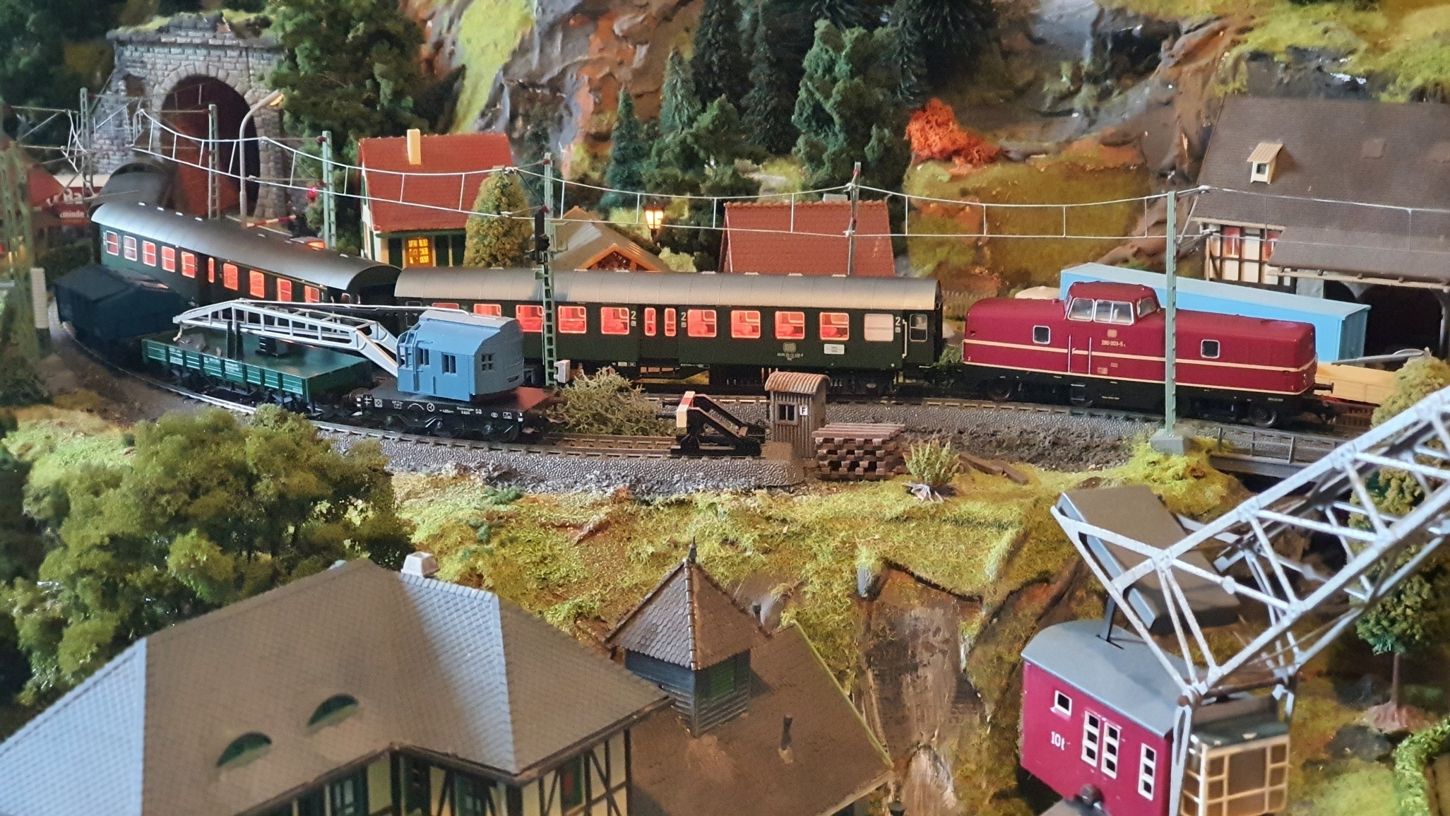 Eine V80 mit der Betriebsnummer 280 003-5 zieht den sogenannten „Bamberger“ durch Katzenbach. Als in den Siebziger Jahren die Ära der in den 50er Jahren entwickelten V80 zu Ende ging, wurden die nur 10 gebauten Maschinen in Frankfurt zusammengezogen. Die neuen Silberlinge waren dem Dienst in den Großstädten vorbehalten und so zogen die nun als V280 laufenden Maschinen meist noch die alten Umbauwagen. Der „Bamberger“, der in Katzenbach hält zieht einen 1. und 2. Klasse AByg 503, einen Umbauwagen 2. Klasse Byg 515 und Gepäckwagen Di-30 „Donnerbüchse“.