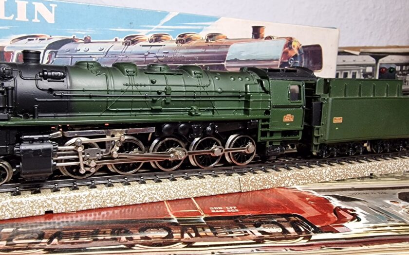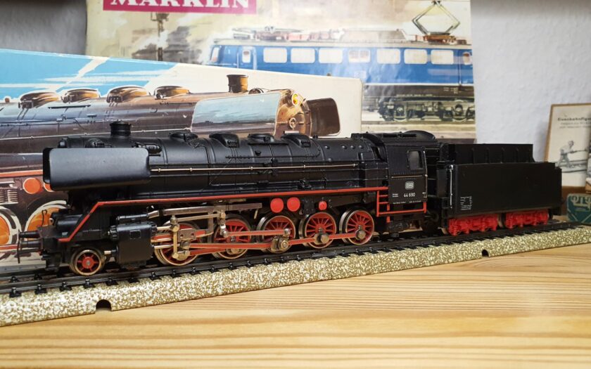 WeiterlesenBR 44 der DB, Gehäuse Zinkdruckguss, Kunststoff-Tender, rote Luftbehälter, Fahrtrichungsumschalter in der Lok, TELEX-Kupplung, Raucheinsatz