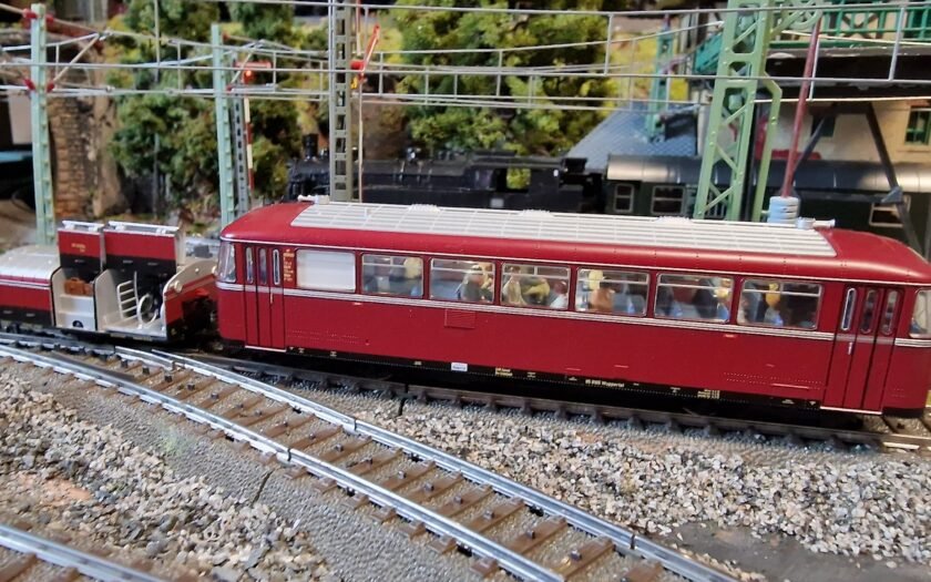 WeiterlesenSchienenbus-Triebwagen Baureihe VT 95.9 mit Einachs-Anhänger VB 141.2 der Deutschen Bundesbahn (DB). Triebwagen VT 95 9165 der ersten Bauserie