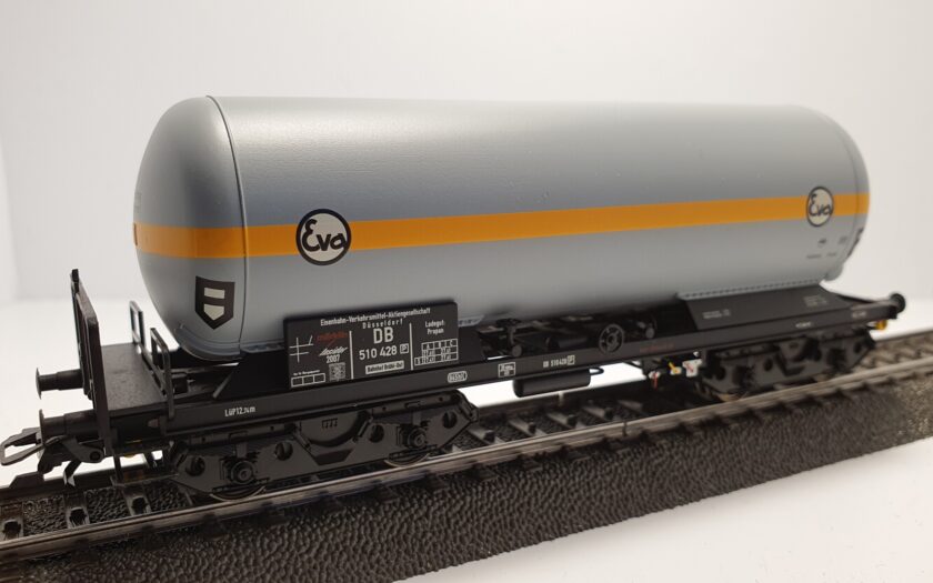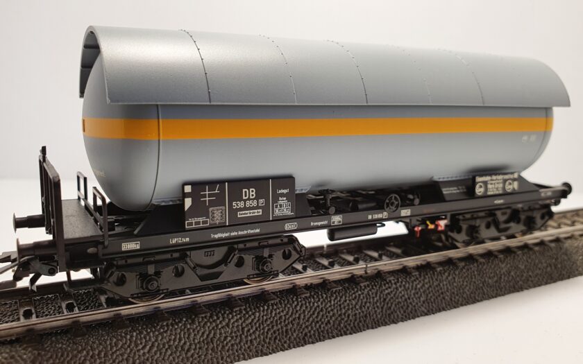 Druckgas-Kesselwagen mit detailliertem Fahrgestell und durchbrochenem Rahmen. Außenlangträger als U-Profil mit Seilösen. Drehgestelle nach Bauart Minden-Dorstfeld. Angesetzte Bremserbühne