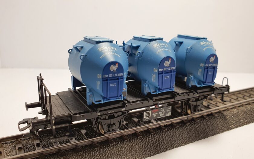 Behältertragwagen Bt 10 mit angesetzten Anschriftentafeln. Abnehmbare Feinschüttgutbehälter. Feinschüttgutbehälter mit jeweils unterschiedlichen Betriebsnummern.