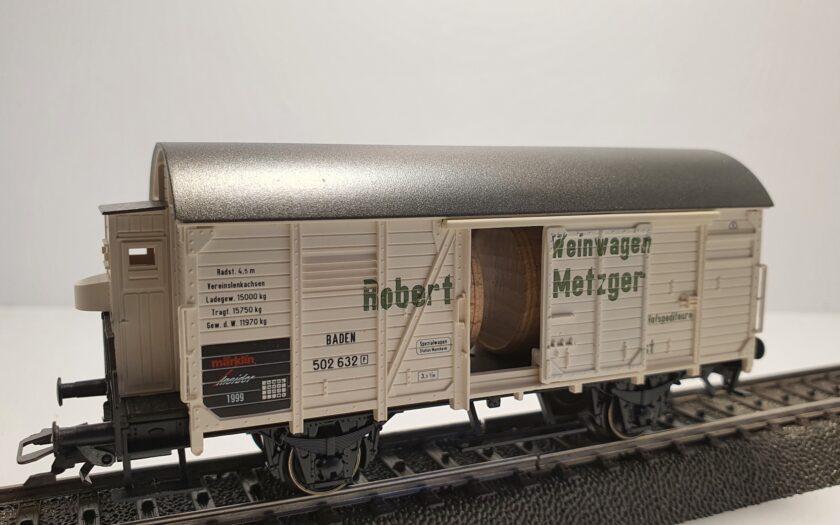 Gedeckter Güterwagen „Robert Metzger“ beladen mit Holzfässern