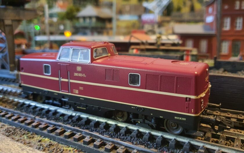 Baureihe V 80 der Deutschen Bundesbahn (DB). Mit dieselhydraulischem Antrieb und Gelenkwellen-Kraftübertragung. Ausführung noch ohne Schalldämpfer. Epoche III aus Zugset 26541