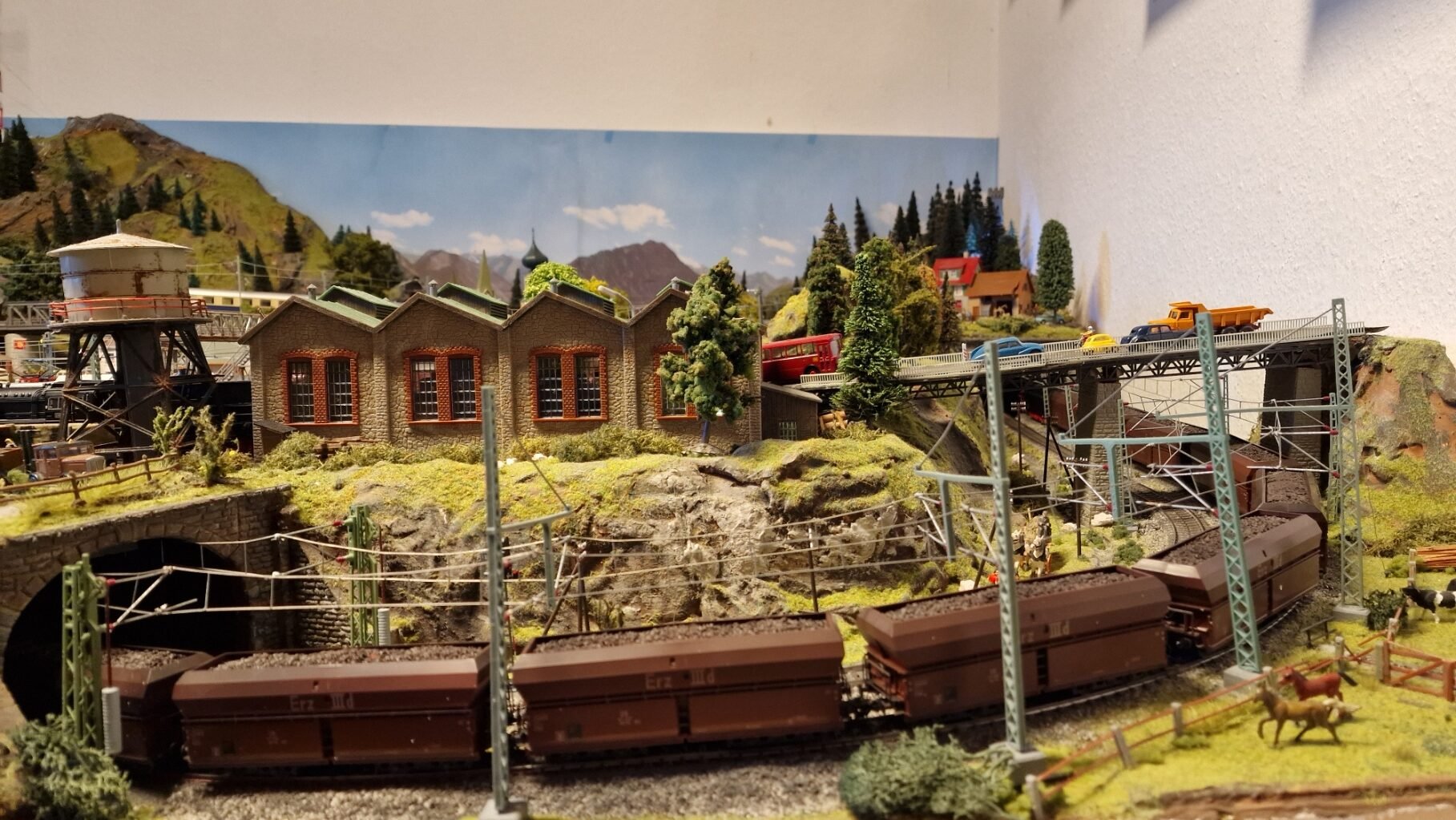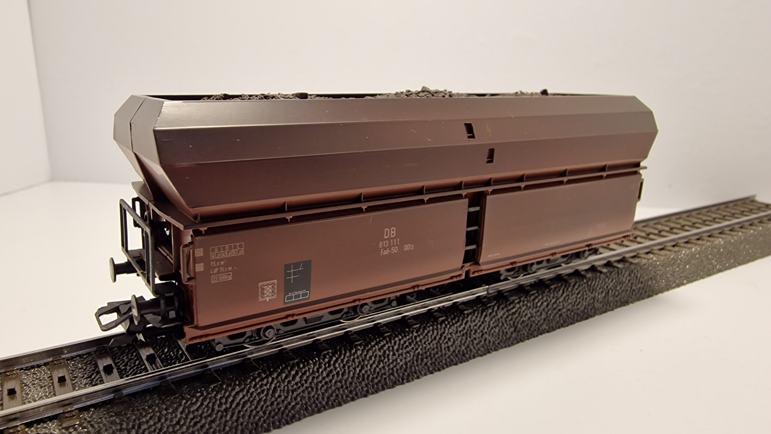 10 Schüttgutwagen mit verschiedenen Betriebsnummern und unterschiedlichen Beschriftungen. Ladungseinsätze beschichtet mit echtem Eisenerz in maßstäblicher Körnung. Farbliche Darstellung der Betriebsspuren.