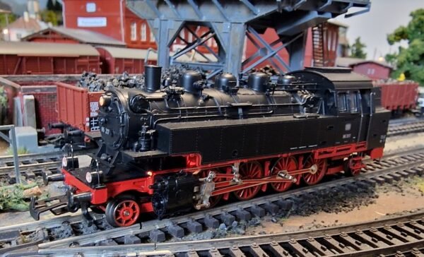 BR 86 der DB, Haftreifen, Kunststoff-Gehäuse, Telex-Kupplung, Bremsatrappe sowie brünierte Räder. Feinere Bedruckung.