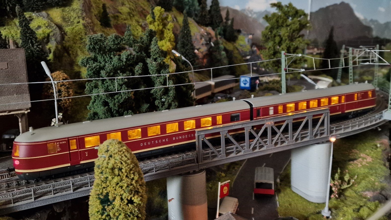 Vorbild: Schnelltriebwagen Baureihe SVT 04 der Deutschen Bundesbahn (DB). Reichsbahn-Bauart SVT 137 „Hamburg“. Zweiteilig mit Jacobs-Drehgestell. Ausführung als FT 231 „Montan Express“ von 1954.