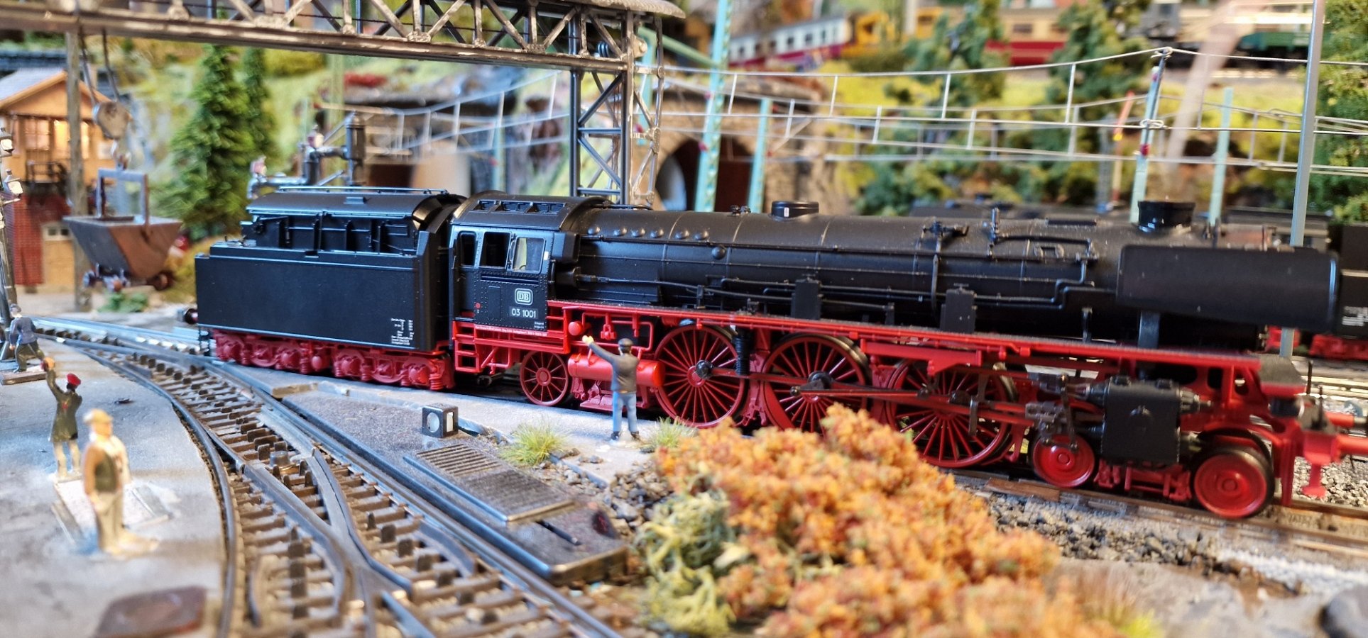 Unverkleidete Umbauversion mit Neubau-Hochleistungskessel, Witte-Windleitblechen, DB-Reflexglaslampen und umgebautem Schlepptender mit Kohlenkastenklappen und Nachschubeinrichtung. Vorlauf-Drehgestell vorbildentsprechend mit Scheibenräder. Betriebsnummer 03 1001. Betriebszustand um 1963