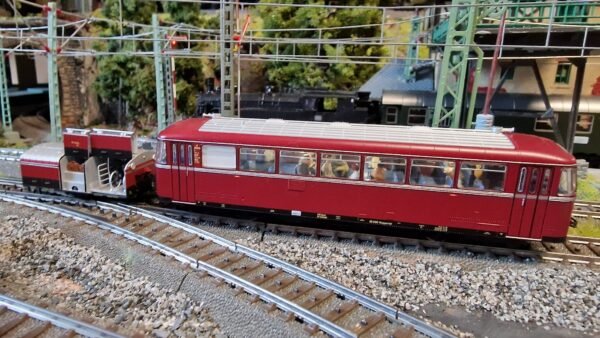 Schienenbus-Triebwagen Baureihe VT 95.9 mit Einachs-Anhänger VB 141.2 der Deutschen Bundesbahn (DB). Triebwagen VT 95 9165 der ersten Bauserie