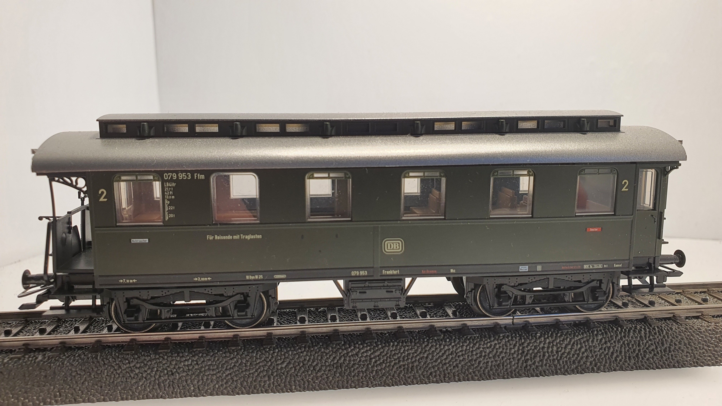 2. Klasse mit Traglastenabteil. Früherer CC4itr Pr14, 3. Bauserie. Ausführung mit einer offenen Endbühne und einem geschlossenen Übergang. Dach und Oberlicht in Umbauausführung. Typspezifische Drehgestelle. Griffstangen, Übergangsbleche und Batteriekasten angesetzt.