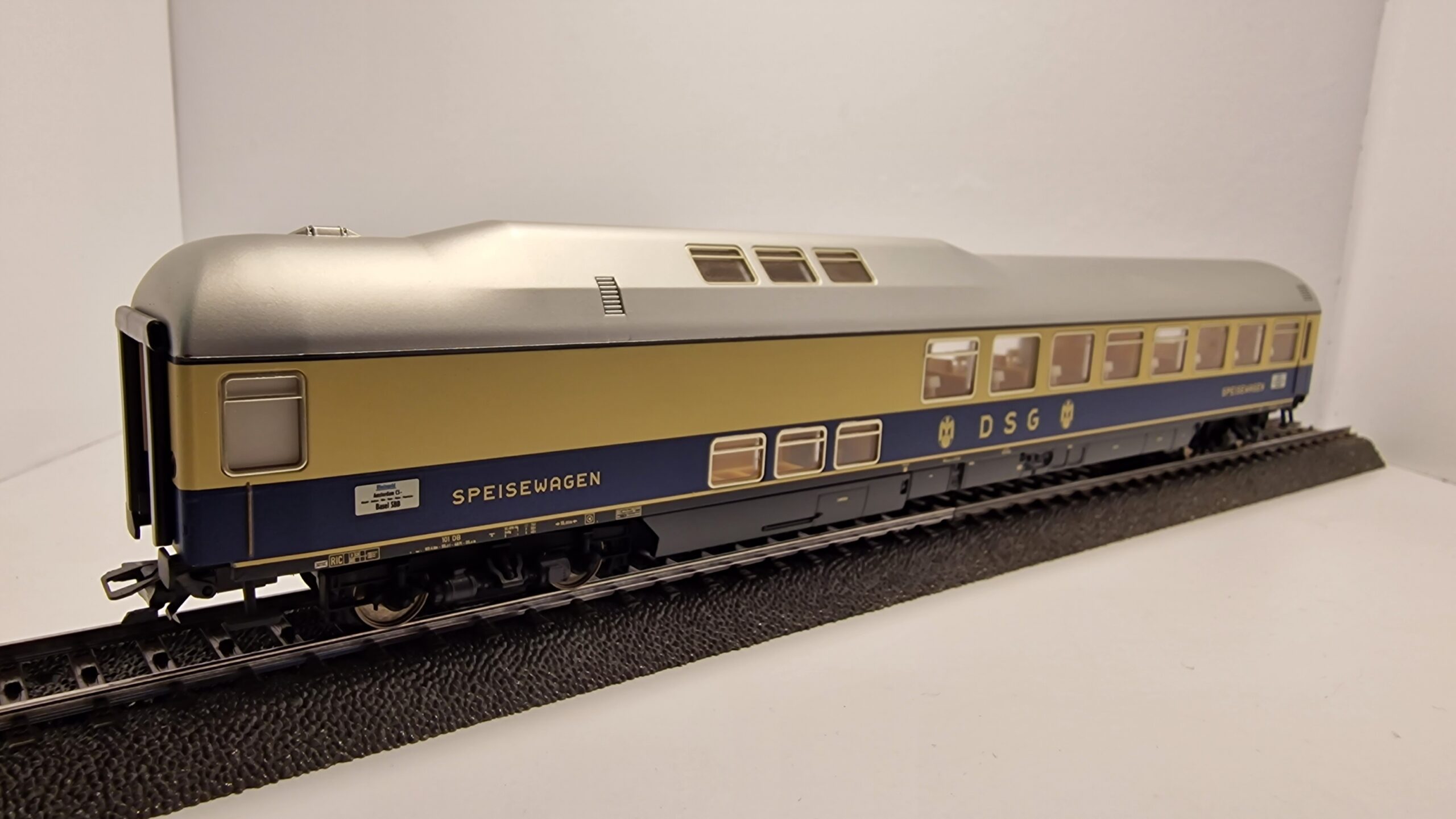 2 Speiseräume, Küche, Spülraum, Büffet und Personalabteil. Sonderbauart für den F-Zug-Verkehr mit Service-Bereich über zwei Etagen, Ausführung mit abgerundeten Dachenden und erhöhtem Dach über der Küche („Buckel-Speisewagen“). Farbgebung für den „Rheingold“ von 1962.