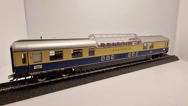 2 kleine Abteile 1. Klasse, ein großes erhöhtes Panorama-Abteil, darunter Diensträume. Sonderbauart für den F-Zug-Verkehr, Ausführung mit abgerundeten Dachenden, Glaskuppel mit 8 seitlichen Fenstern. Farbgebung für den „Rheingold“ von 1962.