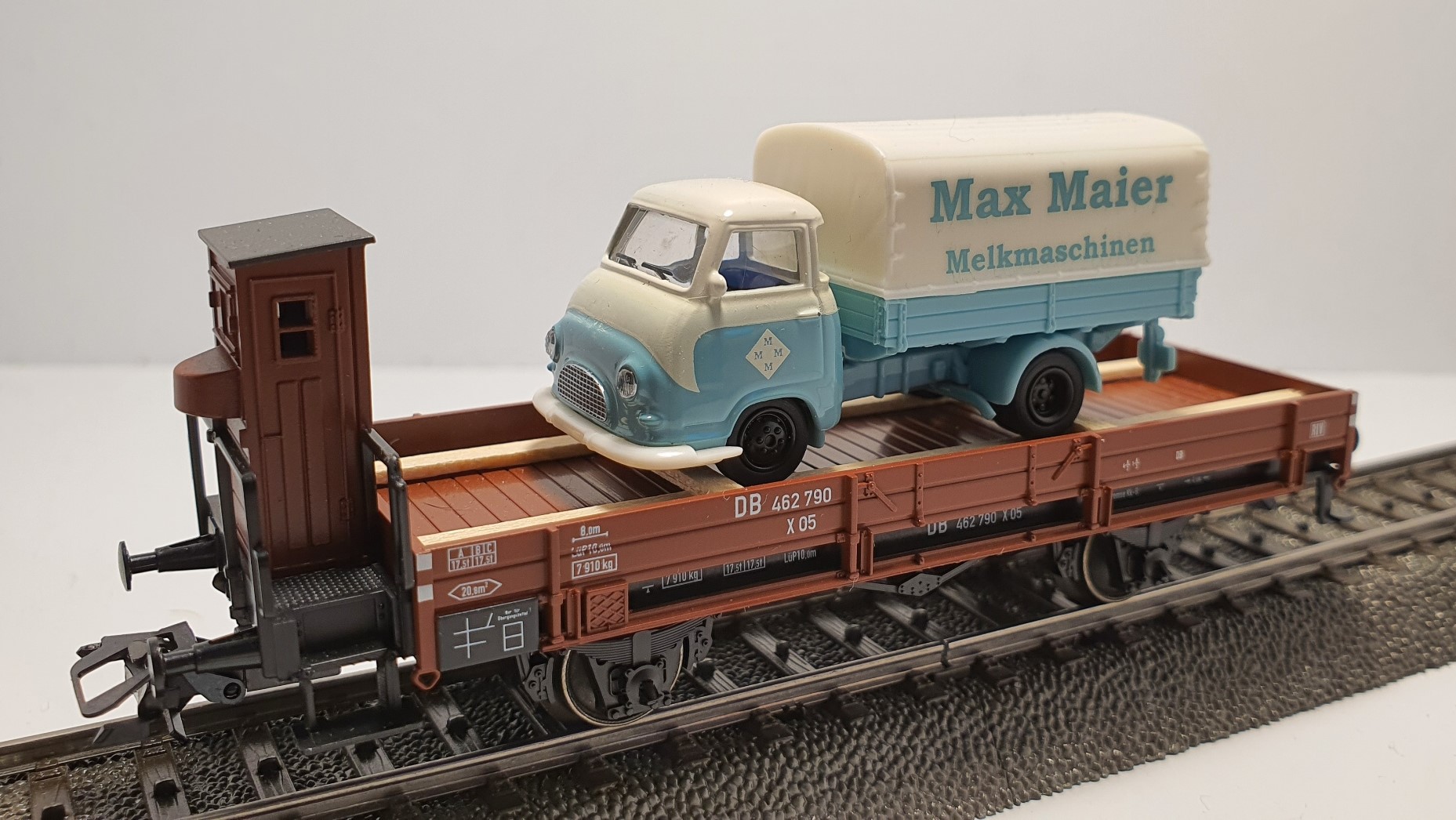 Im Original ist der Wagen mit einem VW-Käfer der Feuerwehr beladen. Der Hanomag von Max Meier Melkmaschinen gehört zu einem Flachwagen X05 aus dem Display Set 00761