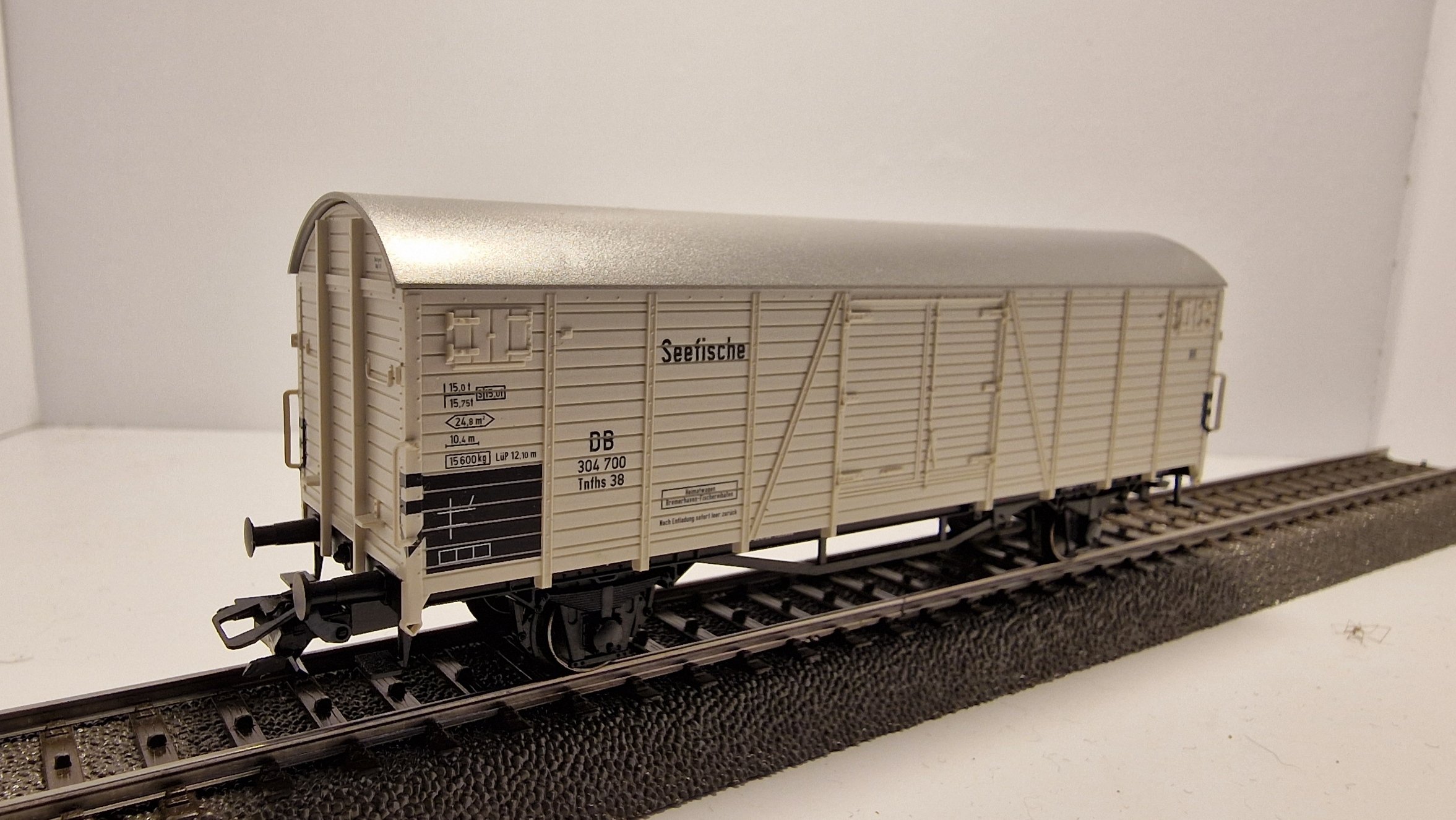 Vorbild: Als vereinfachte Kühlwagenbauart entstanden 1942 die Tnf Berlin (Tnfs38). Die Grundkonstruktion lieferte der bereits zuvor entwickelte Glmhs Dresden, in geschweißter Ausführung. Im Unterschied zu diesen, erhielten die Kühlwagen eine 300mm starke Isolierung und Innenauskleidung mit Zinkblech, um die Holzauskleidung im Inneren gegen Feuchtigkeitseintritt zu schützen. Damit die Türen dicht abschlossen, wichen die Schiebtüren zweiflügeligen Drehtüren. Das Markanteste war jedoch die senkrechte Verbretterung (bei Märklin in der waagerechten Version) ein Verbindung mit dem typisch weißen Anstrich der Kühlwagen. Die Bundesbahn (DB) unterzog an den von ihr übernommenen Wagen, ab Mitte der 1950er, mehrere Bauartänderungen und Modernisierungen. So tauschte man die wartungsintensiven Radsätze mit Gleitlagern gegen moderne mit Rollenlagerung oder baute die Wagenkästen bei unzureichenden Isolierwerten gleich neu auf. Die Wagen behielten dadurch zwar ihre Hauptabmessungen, jedoch verschwand das auffällige Kastengerippe nun unter einer waagerechten (Version wie bei Märklin) Bretterverkleidung, später sogar unter Schichtholzplatten. (Quelle: Brawa)