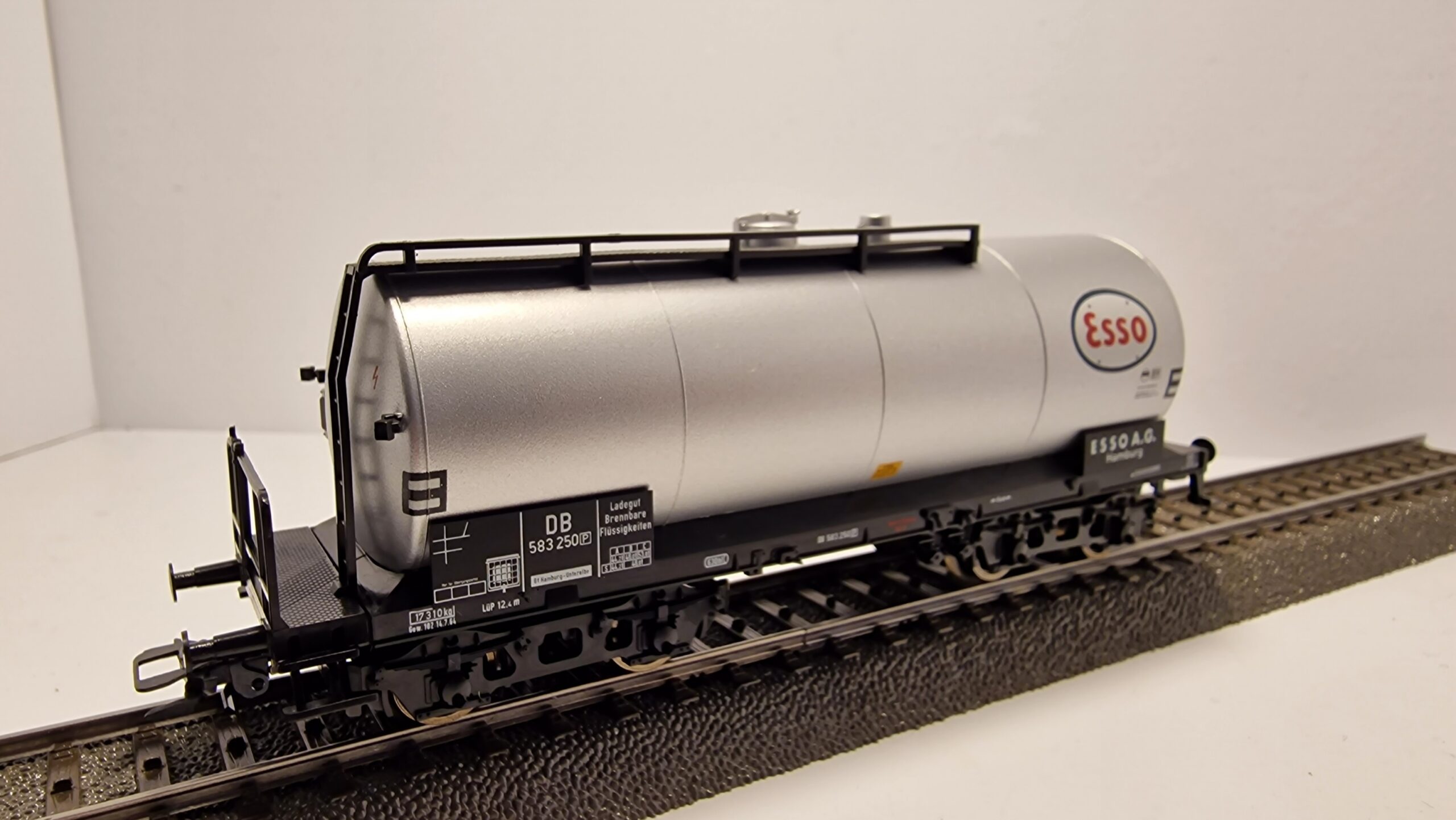 Ältere Bauart mit Pressblech-Drehgestellen, mit Bremserbühne. 1 von 6 Privatwagen der Mineralölfirmen DEA, Esso und SHELL aus Set 46528.