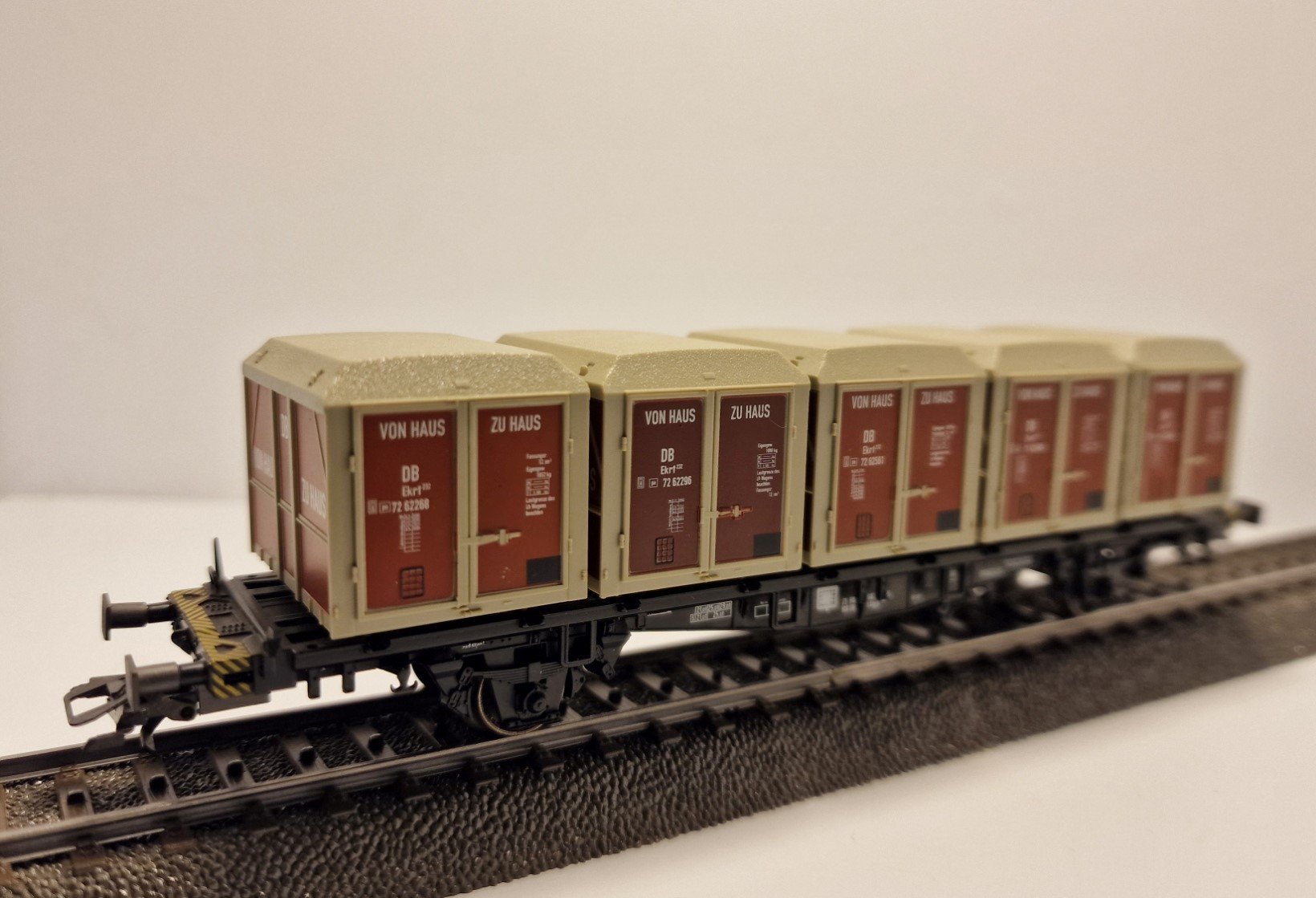 Kunststoff-Gehäuse, beladen mit 5 Behälter braun/grau, Aufschrift Wagennr. 440 7 021-5, Behälteraufschrift VON HAUS ZU HAUS