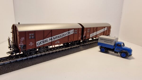 Privatwagen der Firma Märklin, eingestellt bei der Deutschen Bundesbahn (DB). Betriebszustand 1959 zum 100-Jahr-Jubiläum der Firma Märklin, Göppingen. LKW Magirus-Rundhauber „Merkur“ mit Pritsche und Plane.