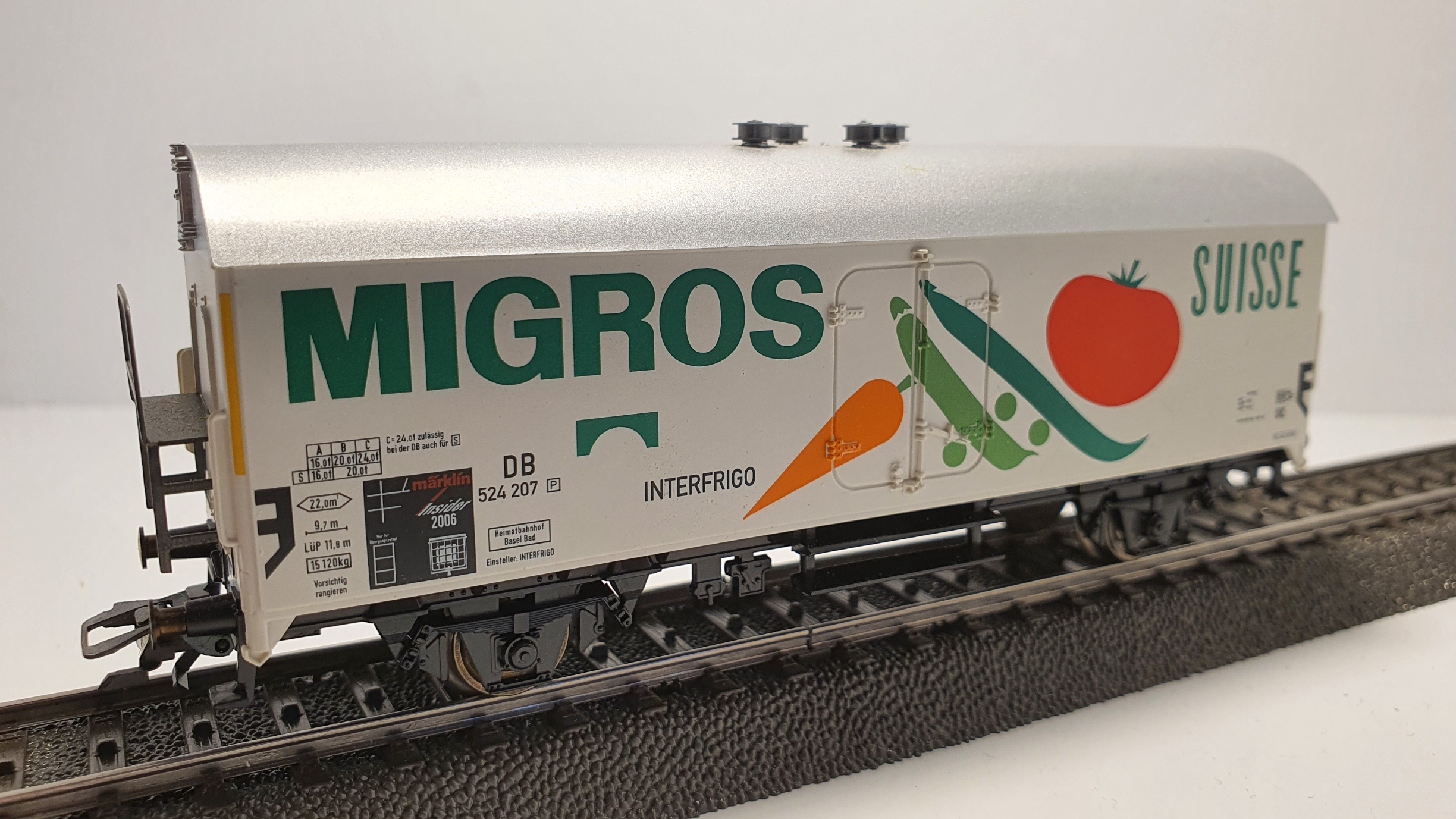 Privatwagen der Firma Interfrigo mit großflächiger Seitenwand-Werbebeschriftung „Migros Suisse“. Verschiedene Bedruckungen auf linker und rechter Seite.