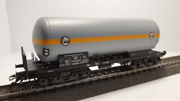 Druckgas-Kesselwagen, eingestellt bei der Deutschen Bundesbahn (DB). Privatwagen der Eisenbahn-Verkehrsmittel GmbH (Eva), Düsseldorf.