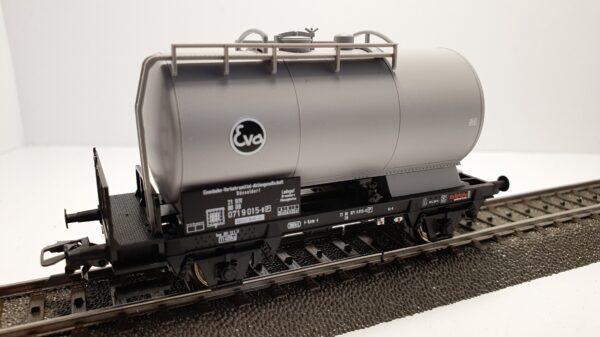 2-achsiger Kesselwagen. Privatwagen der Eisenbahn-Verkehrsmittel-Aktiengesellschaft (Eva), Düsseldorf, eingestellt bei der Deutschen Bundesbahn (DB). Betriebszustand Ende der 1970er-Jahre.