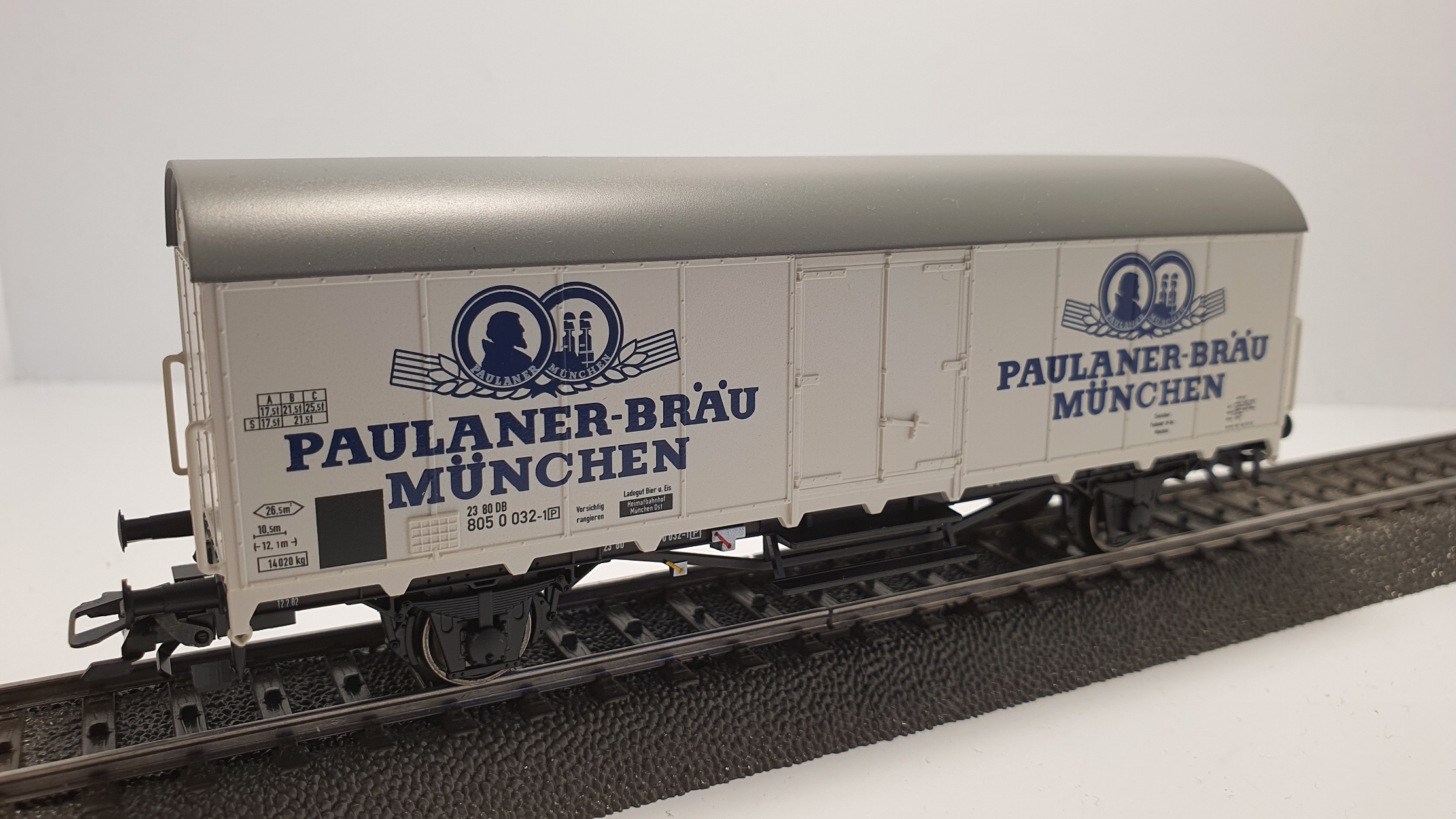 Zweiachsiger Bier-Kühlwagen mit isolierten, glatten Seitenwänden. Stirnseitig ohne hochliegende Bühnen, aber noch mit Beeisungsöffnungen. Privatwagen der Paulaner Brauerei, München, eingestellt bei der Deutschen Bundesbahn (DB). Betriebszustand der Epoche IV.