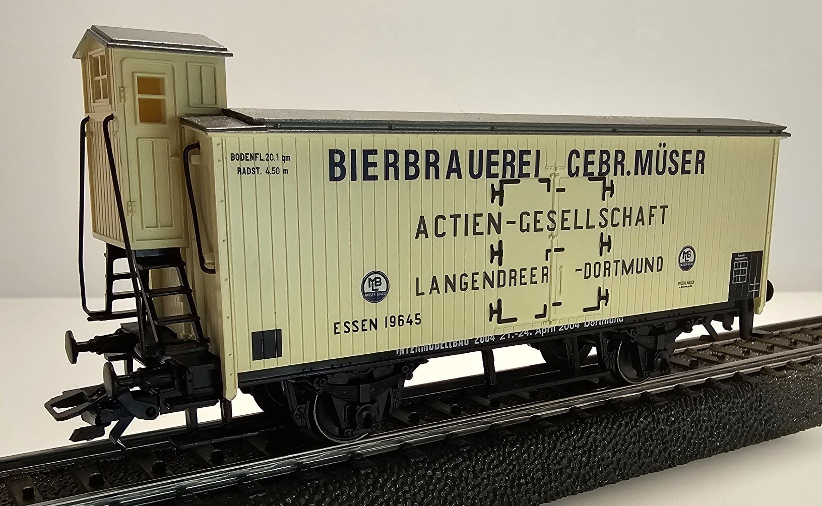 48604 Gedeckter Güterwagen G10 in Verbandsbauart mit Bremserhaus Bierbrauerrei Gebrüder Müser, Dortmund Vorbild Sondermodell zur Intermodellbau 2004 in Dortmund, Auflage 5000 Stck Vorbildfoto: Wikipedia https://de.wikipedia.org/wiki/Datei:KillingProdukte_05.jpg Merkmale Epoche III Bahngesellschaft Privat LÜP 11,0 cm Katalogjahr 2004 Kupplung KKK Wagennummer 19645 Andere ansehen: 29539 47898 << Zurück zur Liste