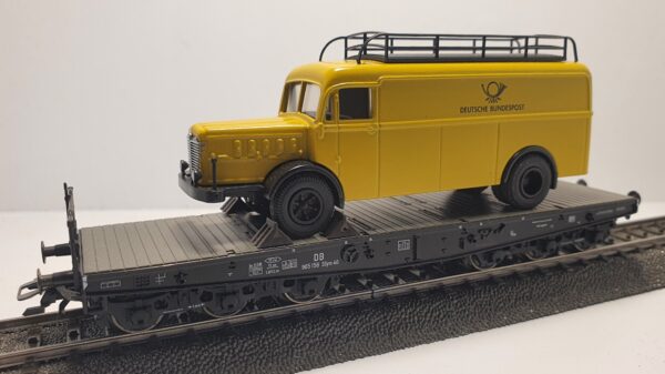 Sechsachsiger Schwerlast-Flachwagen der Bauart SSym 46 mit Post LKW