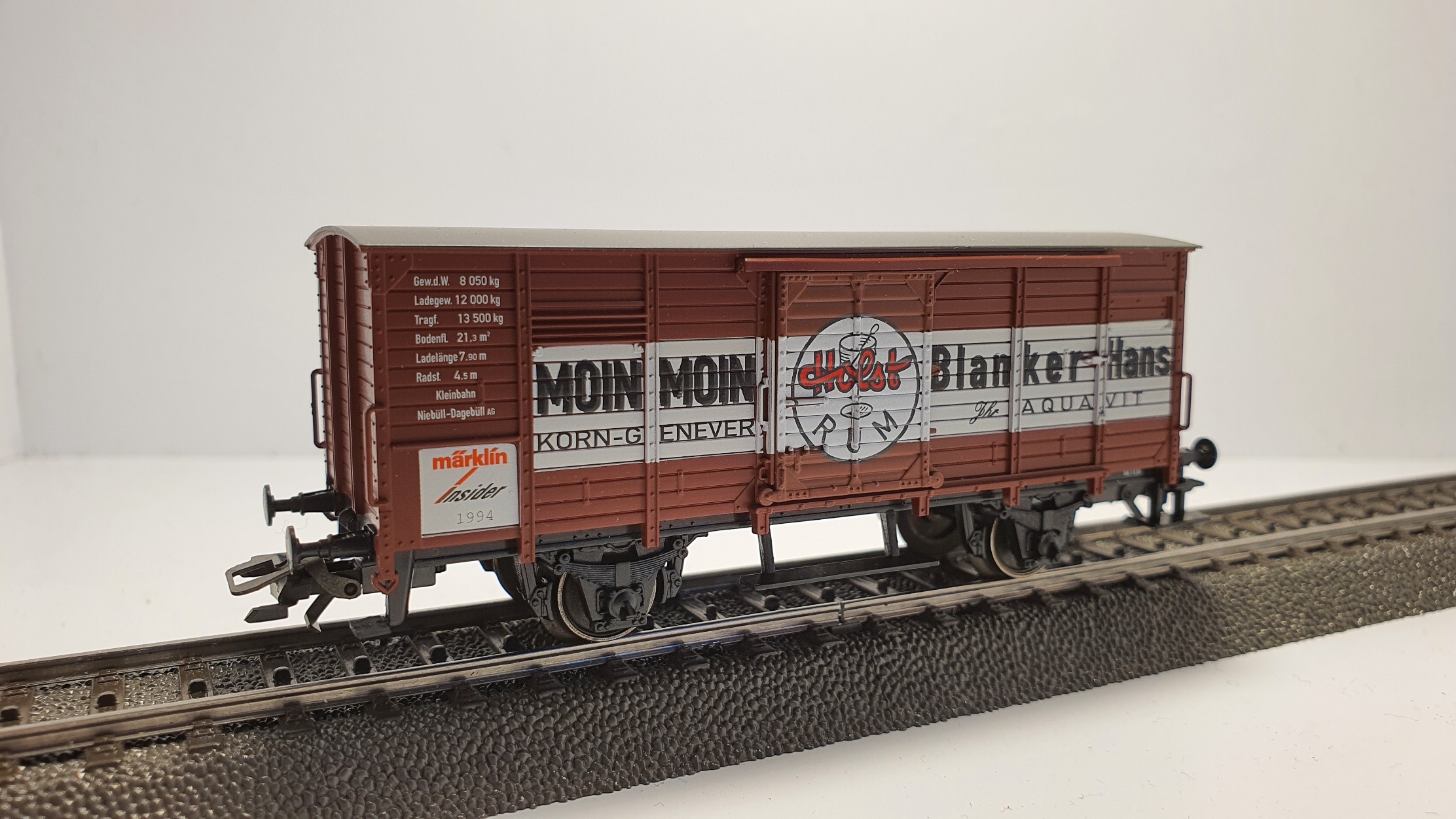 Gedeckter Güterwagen „Holst Rum“ bewegliche Türen, Beschriftung „Moin Moin – Korn-Genever, Holst Rum, Blanker Hans – Ihr Aquavit“