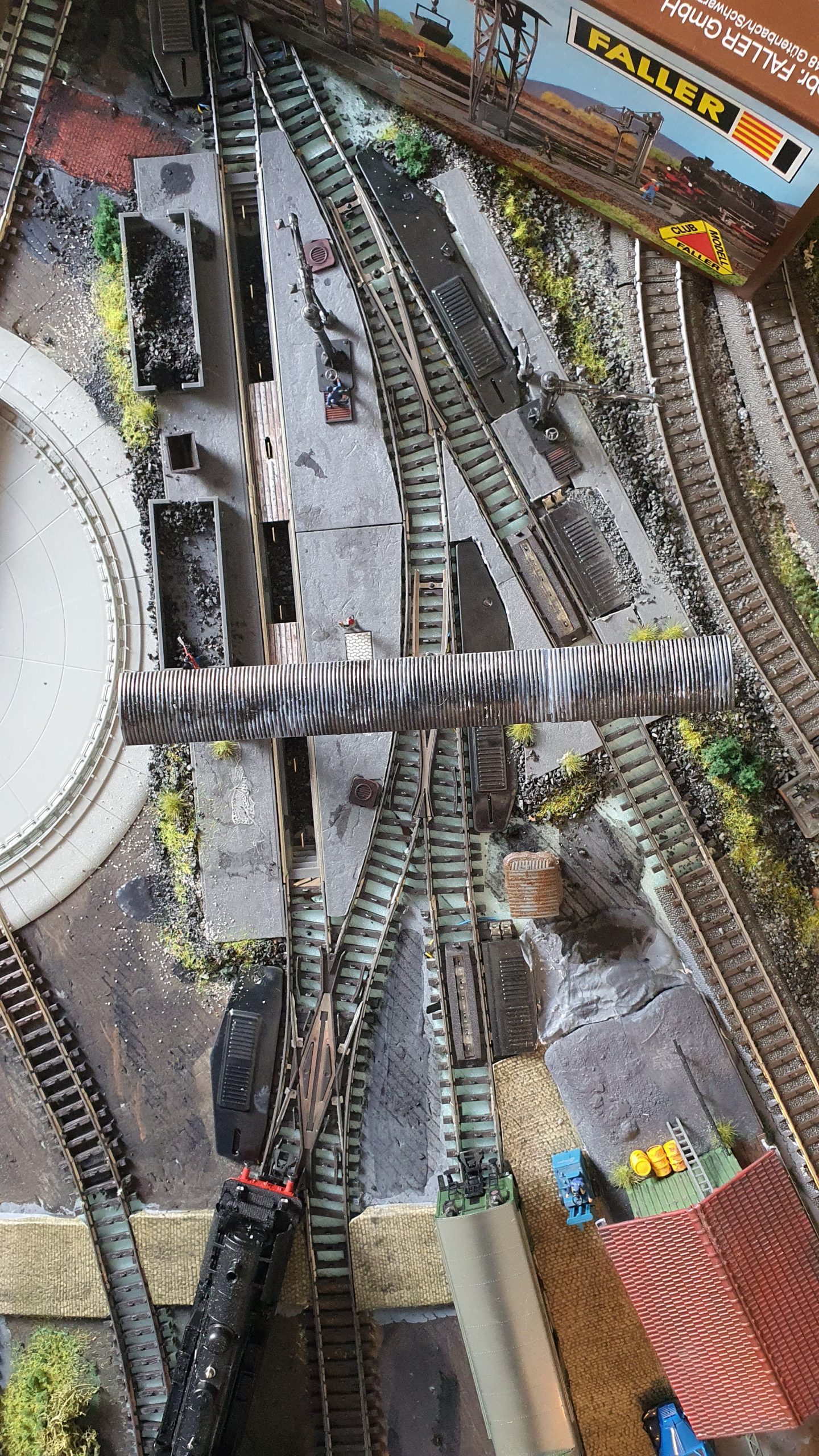 Kürzlich hat der Bahnhofsvorstand eine Entschlackungsanlage von Faller günstig erstehen können. Damit erhält das Bahnbetriebswerk einen wichtige Komponente zur Behandlung der Lokomativen. Zweifelhaft war, ob denn der den Behandlungsgruben beiliegende Mittelleiter auch funktioniert. Das kann mit Ja beantwortet werden. Hier hat Faller so gerade den Abstand eingehalten um den Schleifer an den Loks mit Strom zu versorgen. Wegen der beengten Platzverhältnisse mussten die Gruben mit dem Dremel gekürzt werden und die beiliegenden Fundamente zugeschnitten werden. Zu guter letzt wurden die Teile ordentlich mit „dreckigen Farben behandelt, damit das Ensemble auch „betriebsecht“ aussieht. Die Gruben wurden zusätzlich noch mit Dekorplatten als Übergang abgedeckt. Die Wasserkräne wurden bemalt und mit Kalkresten versehen. Tipp: Billige Künstlerfarben aus dem Sonderpostenmarkt sind vollkommen ausreichend um dreckige Töne und Alterungssspuren aufzubringen.